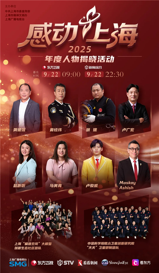 龚建强、姜经纬、胡建、卢广宏、赵听听、马寅青、卢俊威、Maskay Ashish、上海“模速空间”大模型创新生态社区团队、中国科学院微小卫星创新研究院“天关”卫星研制团队等10位先进个人和集体荣获2025“感动上海”年度人物称号。