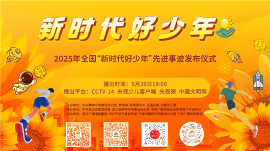 由中央精神文明建设办公室、教育部、共青团中央、全国妇联、中国关工委主办的2025年全国“新时代好少年”先进事迹发布仪式将于9月20日19:00在CCTV-14、央视少儿客户端、央视频、中国文明网播出。敬请关注!