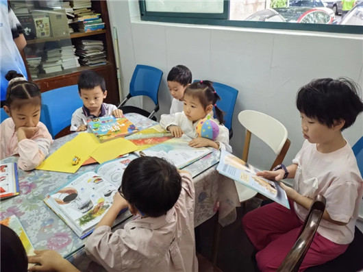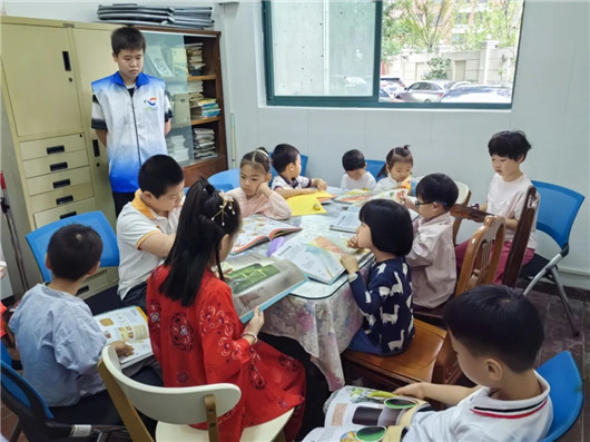 活动现场,孩子们围坐在铺着花纹桌布的桌旁,社区工作人员也在一旁暖心陪伴。《DK趣味数学百科》《知识科普类童书绘本》等色彩鲜艳、内容丰富的书籍铺满桌面,瞬间抓住了孩子们的目光。大家或低头专注翻阅绘本,小手指轻轻滑过印着科普知识的插图;或与身边小伙伴小声分享书中的奇妙发现,稚嫩的讨论声让整个空间都洋溢着生机。还有小志愿者不时走到孩子身边,用生动的语言讲解书中的数学奥秘与科学趣闻,引导孩子们深入探索知识世界。