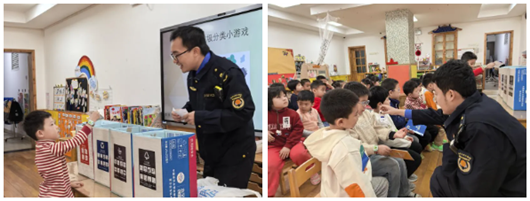 在法宣课上,队员们通过PPT演示,向孩子们介绍了城管执法队伍的职能和工作流程,帮助孩子们建立对城管队伍的基本认知。随后,围绕本次垃圾分类主题,队员们拿出贴有“干垃圾”“湿垃圾”“可回收物”“有害垃圾”标签的4个纸板箱,结合实物与图片材料,并依据《上海市生活垃圾管理条例》,用通俗易懂的语言讲解如何正确分类投放垃圾。孩子们本身对垃圾分类已有一定的基础认知,经本次讲解皆有了更深入的理解,纷纷踊跃参与模拟垃圾分类投放。活动最后,队员们为孩子们贴上印有卡通城管形象及队徽的贴纸,鼓励他们争做“城管小卫士”,将文明习惯融入日常生活中。