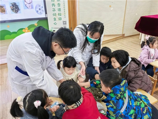香囊制作环节,专业药师一起手把手指导孩子识别药材、讲解养生原理与制作方法。孩子们在医护人员和老师陪伴下亲手挑选填充药材,一个个香气四溢的香囊新鲜出炉。亲手制作的体验,不仅让他们感受到传统手工艺的乐趣,更在实践中增强了对中医药文化的认同与喜爱。