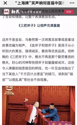 上海2018年起与金岩长期搭档,参加过各大卫视节目,并以《三把斧子》入选全国首届相声小品大赛决赛,备受好评。捧哏风格沉稳、谐趣,擅长京剧、鼓曲,是不可多得的高学历相声演员。