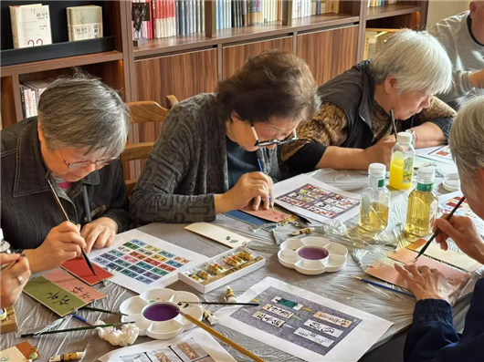 展开宣纸书签,蘸一笔浓墨,银龄读者们在书画交织的天地间畅意挥洒。老人们或提笔誊抄鲁迅笔下“世上本没有路”的铿锵词句,或以水墨晕染勾勒出百草园的草木葱茏,指导老师穿梭其间,从调墨技法到构图灵感,手把手带大家将文字化作纸上风景。活动尾声,大家举起亲手制作的书签合影,笑意盈盈:“这书签,要夹在《朝花夕拾》里珍藏!”