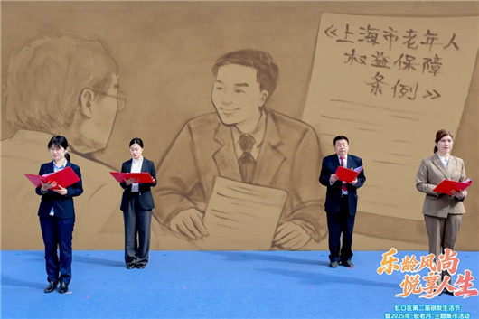 活动中,上海市老年基金会“最美志愿服务者”郭奇章、上海市金牌养老顾问郑泓、曲阳路街道玉二居民区党总支书记兼主任张荣美、虹口区养老服务发展中心陈姝沙带来沙画朗诵《友好虹口,乐龄生活》,深情描绘了虹口长者幸福生活的美好长卷。