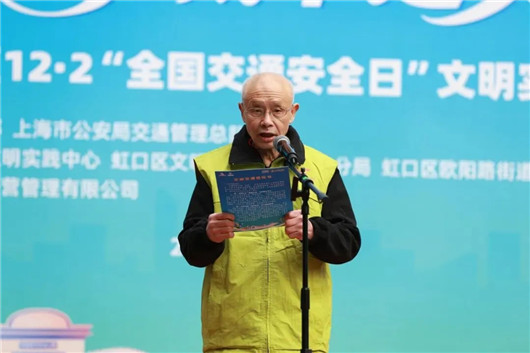 虹口辖区老年人比例比较高,这类人群也是交通事故发生后最脆弱的群体。现场成立了中老年文明交通实践员队伍,将发挥他们的作用,在交通事故易发点进行文明劝导。文明交通实践员代表谢焯华老先生登台宣读《文明交通倡议书》。谢焯华多年如一日参与文明交通志愿服务,他亦是文明交通实践员队伍的缩影。