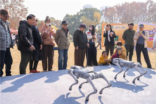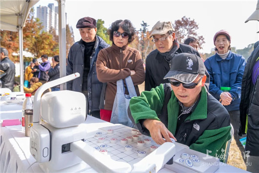 虹口区社区学院带来的机器狗与下棋机器人人气爆棚。“很好玩!机器人也很聪明,能感受到为了适合大众体验设置了初级版本。”刚体验完下棋机器人的市民费先生笑着告诉记者,“我们就住在和平公园附近,昨天看到搭建的帐篷就特别期待,今天第一时间入场体验!”