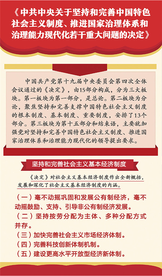 党的十九届四中全会聚焦坚持和完善支撑中国特色社会主义制度的根本制度、基本制度、重要制度,首次将按劳分配为主体、多种分配方式并存和社会主义市场经济体制纳入基本经济制度,进一步拓展了我国基本经济制度的内涵。