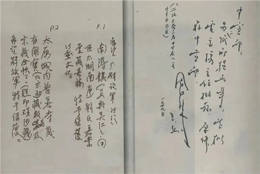 周恩来同志指示保护嘉业堂藏书楼书信,现藏于湖州市档案馆。信中指出:“希望解放军讨论南浔镇(吴兴吴江之间,在太湖南岸)刘氏嘉业堂藏书楼,特予保护,以重文化。”图片来源:“浙江党史”微信公众号