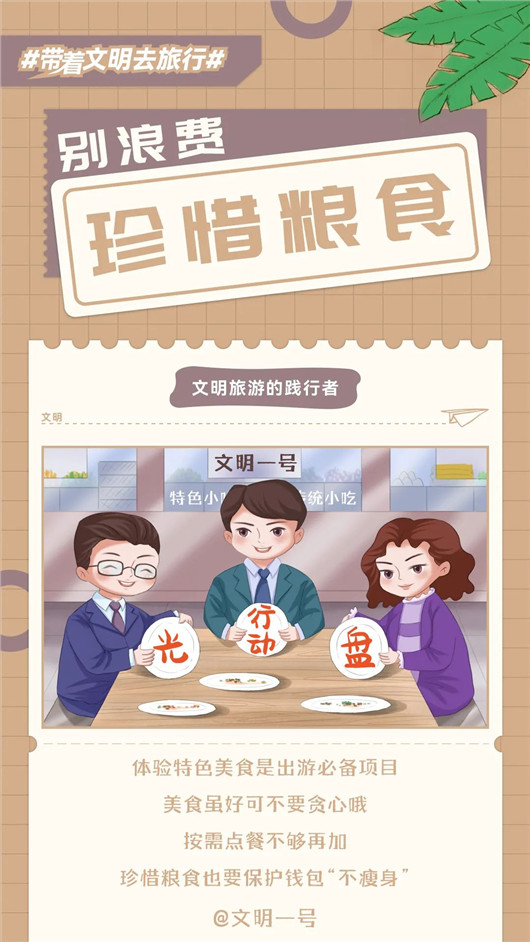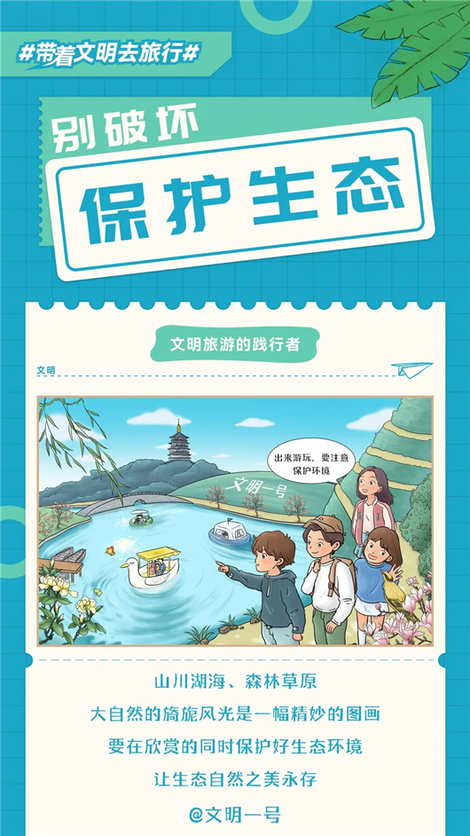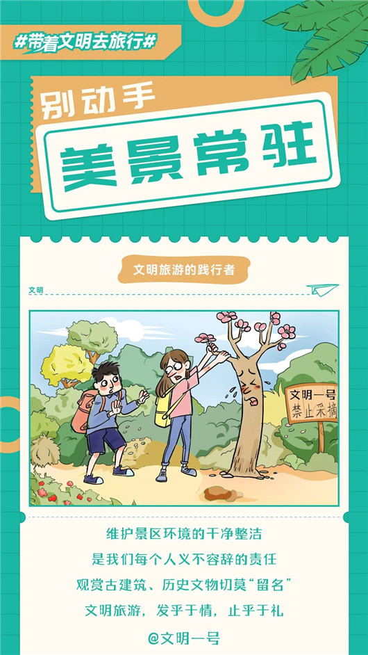 四、文明健康出行。遵守生态环境、文物古迹保护规定,尊重当地风俗习惯。维护公共秩序,依序排队,不拥挤,不争抢。尊重他人权益,遇到纠纷理性处理。做好个人防护,保持良好卫生习惯。低碳节约,绿色出游。