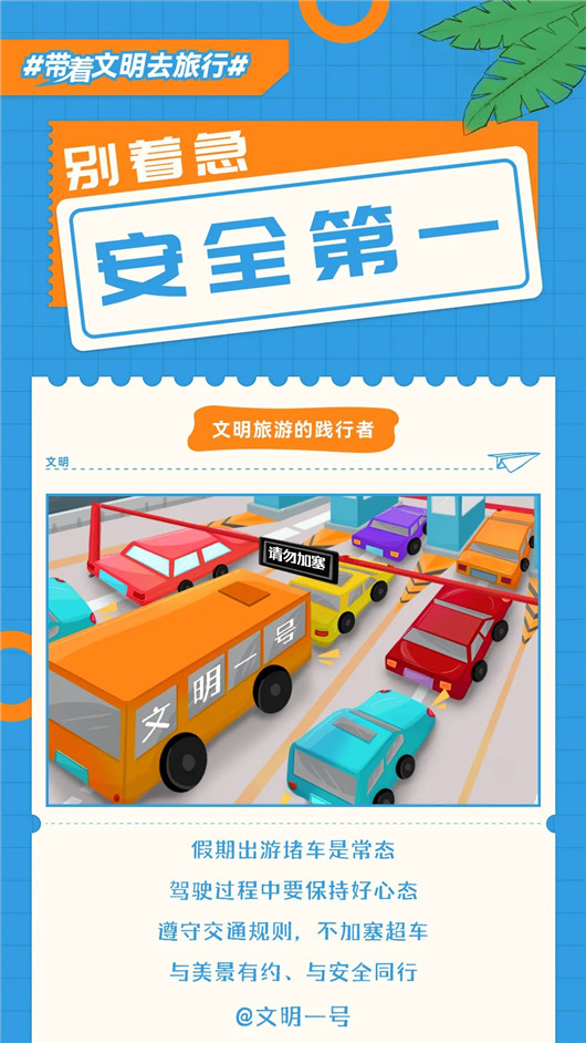 一、合理安排行程。提前了解途经地、目的地天气、交通及旅游景区开放情况和门票预约措施,合理规划旅游线路和时间。尽量避开假期客流高峰引发的拥挤,避开交通拥堵路段、时段。