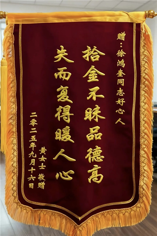 9月17日,市民黄女士来到上海虹口停车管理有限公司,送上一面写有“拾金不昧品德高、失而复得暖人心”的锦旗,感谢公司员工徐鸿奎的拾金不昧。