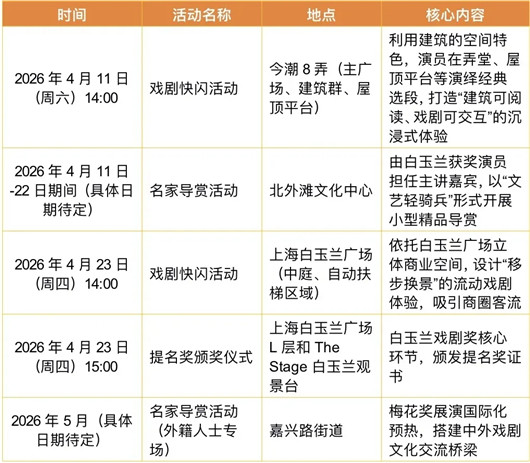 据悉,本次快闪活动由上海白玉兰戏剧表演艺术奖组委会办公室与虹口区委宣传部共同主办。本届白玉兰戏剧奖颁奖系列活动以“时代有戏、玉兰绽放”为主题,联动首届中国戏剧梅花奖国际化优秀剧目展演,共同打造“北梅南兰”双奖辉映的文化盛事。4月至5月,多场戏剧快闪、艺术导赏及提名奖颁奖典礼将陆续落地虹口,为市民游客带来更多优质的戏剧文化体验。
