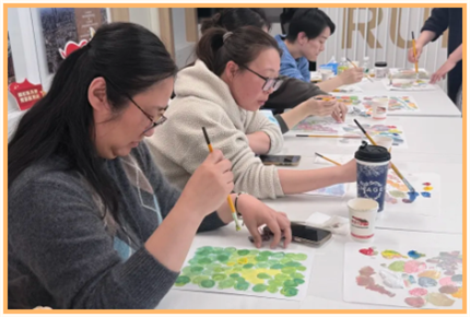 理论讲解结束,青年们纷纷拿起画笔,跃跃欲试。大家蘸取颜料、精心调色,在画布上大胆落笔创作。期间,老师全程巡堂指导,精准点拨色调搭配与笔触运用。