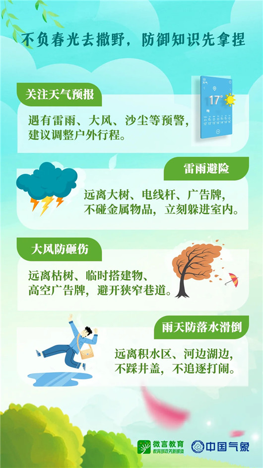 春光正好,草木欣然,正是踏青出游、亲近自然的好时节。@微言教育联合@中国气象推出春日安全知识,伴你平安“赴春”——