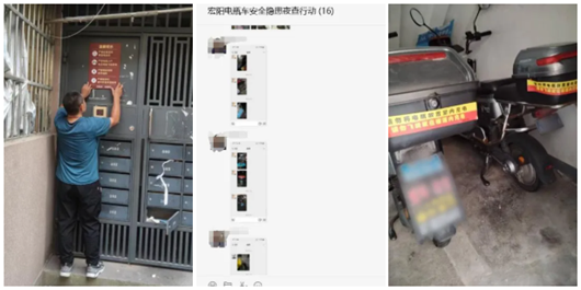 宏阳物业的基层党组织充分发挥战斗堡垒作用,一方面组织党员与志愿者带头开展宣传,在宣传栏、楼道口等显著位置张贴《温馨提示》,明确“严禁在楼道内停放电动车”“严禁电瓶入户、私拉电线飞线充电”;同时针对老年群体主动上门,结合真实事故案例,用通俗易懂的语言“以案说法”,让安全意识的种子在居民心中生根发芽。另一方面,为切实破解“飞线充电”这一老旧小区管理顽疾,物业加大巡查力度,联合第三方力量开展夜间安全隐患排查:发现存在“飞线”或室内充电行为且家中有人的,即时上门劝导整改;对存在安全隐患但家中无人或无法立即整改的情况,则张贴安全提示、拍照登记并纳入台账,为后续的集中整治与回访跟踪提供依据,形成管理闭环。