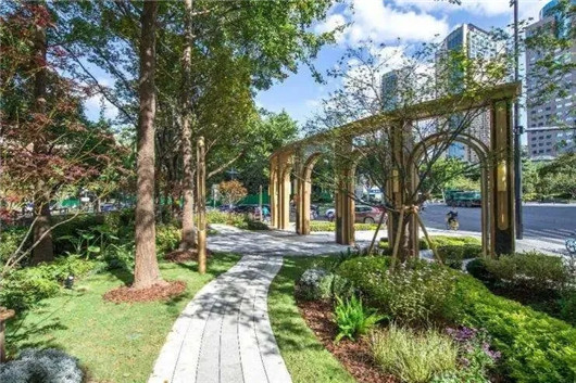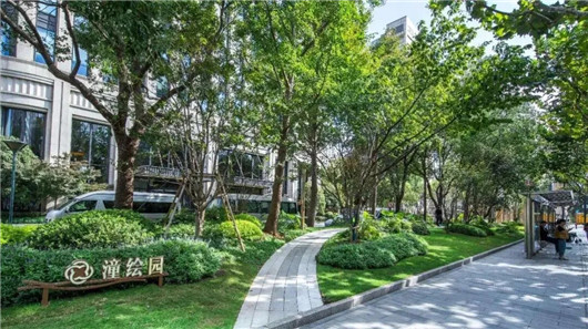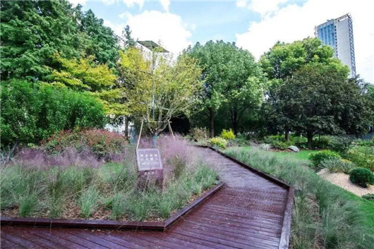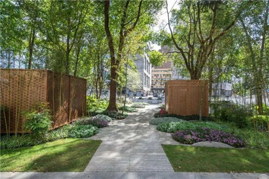 入口之间一条游园步道相连,在保留原有香樟、银杏等植物基础上,新增开花色叶特色小乔木,龟甲竹、黄金间碧玉竹、红枫、鸡爪槭、红粉佳人樱、林下耐荫地被,并用高低错落的地形,打造有趣的苔藓微景观,在都市中展现“苔痕上阶绿,草色入帘青”的自然美感。