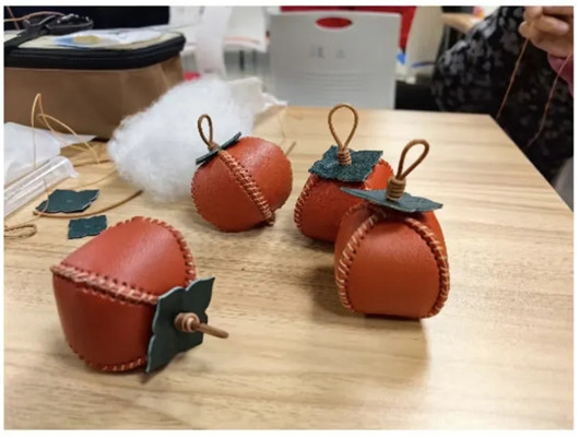 在老师的示范带领下,大家完成了柿子主体缝制,随后搭配上叶子,并将填充棉均匀地塞入主体中,再做好收口步骤。随着时间的推移,一个个活灵活现的柿子诞生了。“看,我做的这个,像不像真的柿子?”杨阿姨举起自己的“杰作”展示给大家;旁边的周叔叔不甘示弱:“看我的缝线,是不是更扎实!”