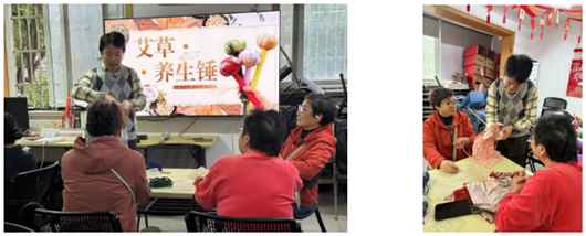 老师将艾草养生锤的历史渊源、制作工艺与养生价值娓娓道来。从《本草纲目》中“艾叶能灸百病”的记载,到古代文人“手持艾锤敲经脉”的雅趣,居民们在一针一线的制作中,感受着非遗文化跨越千年的生命力。