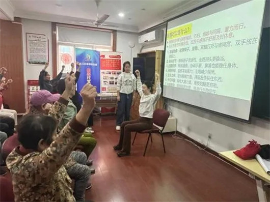 玉二居民区新时代文明实践站特邀复旦大学中山医院研究生科普讲师团心内科林鸿博士开展“强筋骨,防跌倒”养生健身操科学指导活动,肝病科付思芸博士全程协助。林博士结合中老年人骨骼特点和常见跌倒风险,针对性介绍了一套简单实用的健身操,从热身运动到核心动作,再到放松拉伸,每一步都详细拆解。活动结束后,大家纷纷表示收获颇丰,掌握了居家养生的实用妙招。